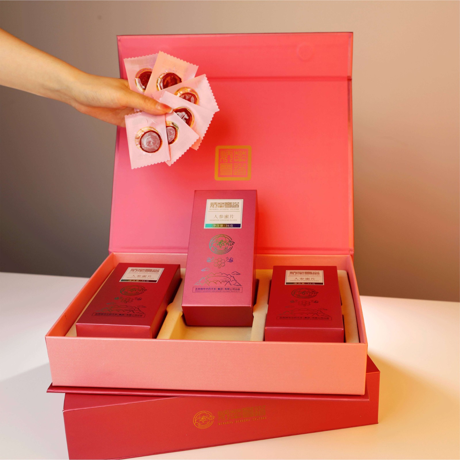 選用長(zhǎng)白山5年足齡鮮參,選取人參主根最優(yōu)部分,皂苷豐富、參味純正、紋理清晰、參蜜交融、甜而不膩、嚼勁十足,一次一片,便于攜帶。